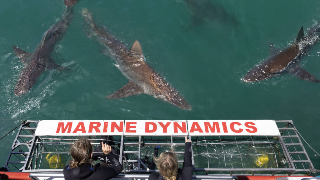 Next, you navigate to prime whale viewing areas within the bay. The Southern right whale season extends from June to November, during which our focus shifts to observing these magnificent creatures as they visit our coastal waters for mating and calving purposes. Throughout the year, we may also encounter the more reserved resident Bryde’s whale. Additionally, we may encounter the majestic Humpback whales during the initiation and conclusion of their migration cycle. Our region also boasts three distinct dolphin species—common, bottlenose, and the endangered humpback variety. This marine adventure includes a visit to the shark cage diving vessels in the area to offer a sighting of a bronze whaler shark or the awe-inspiring great white shark.